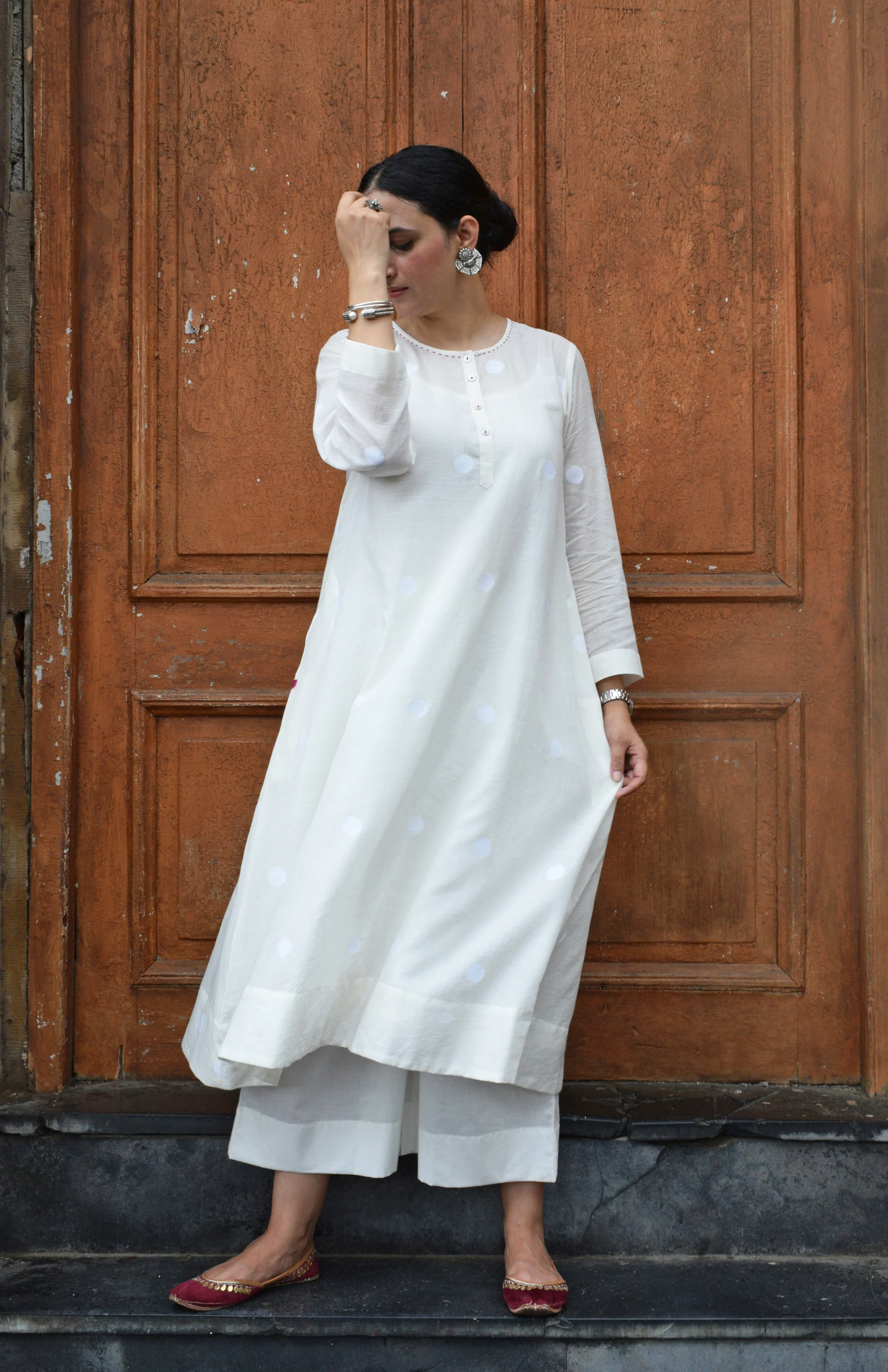 Description: A line handwoven jamdani cotton kurta. This kurta features a round and a V shaped neckline. It is a comfort fit kurta with broad hemline fold. This jamdani kurta comes with a slip.